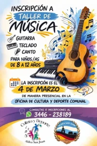 Desde la Comuna de Aldea San Juan, a través del área de Cultura y Deporte, invitamos a jóvenes y adultos a sumarse al Taller de Música, una propuesta abierta para quienes deseen aprender, compartir y disfrutar de la música en un espacio de encuentro y expresión. El taller incluye clases de música y canto, y ofrece además la posibilidad de
