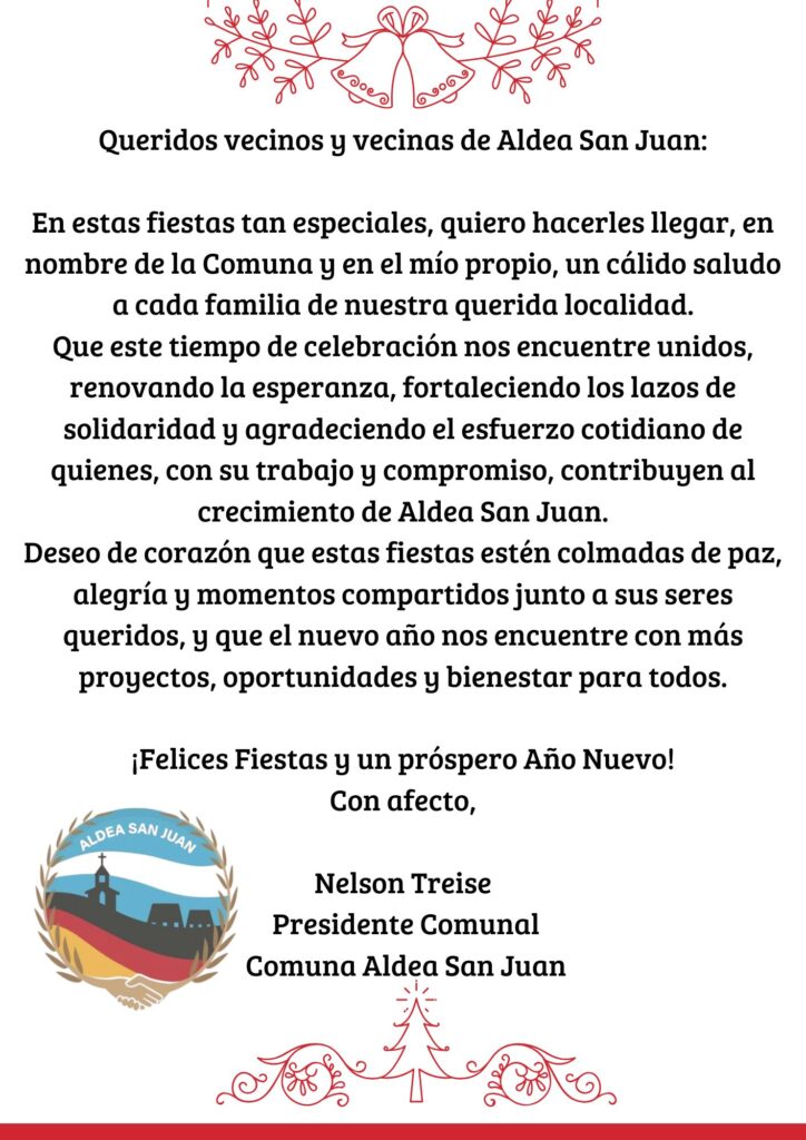 En el marco de las fiestas de fin de año, el Presidente Comunal de Aldea San Juan, Nelson Treise, hizo llegar un mensaje especial a toda la comunidad, compartiendo palabras de unión, esperanza y agradecimiento.
